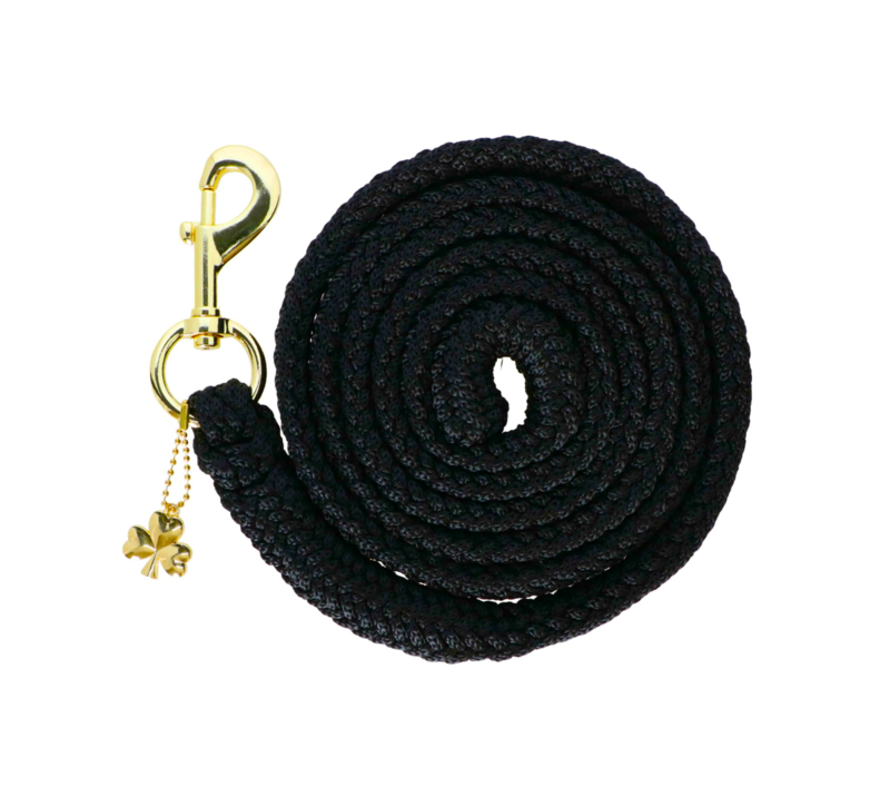 Goudkleurige musketonhaak met een 'lucky charm' bedel van Bucas. Deze halstertouwen passen perfect bij de navy en wine kleurige Show-Line halsters van Bucas.